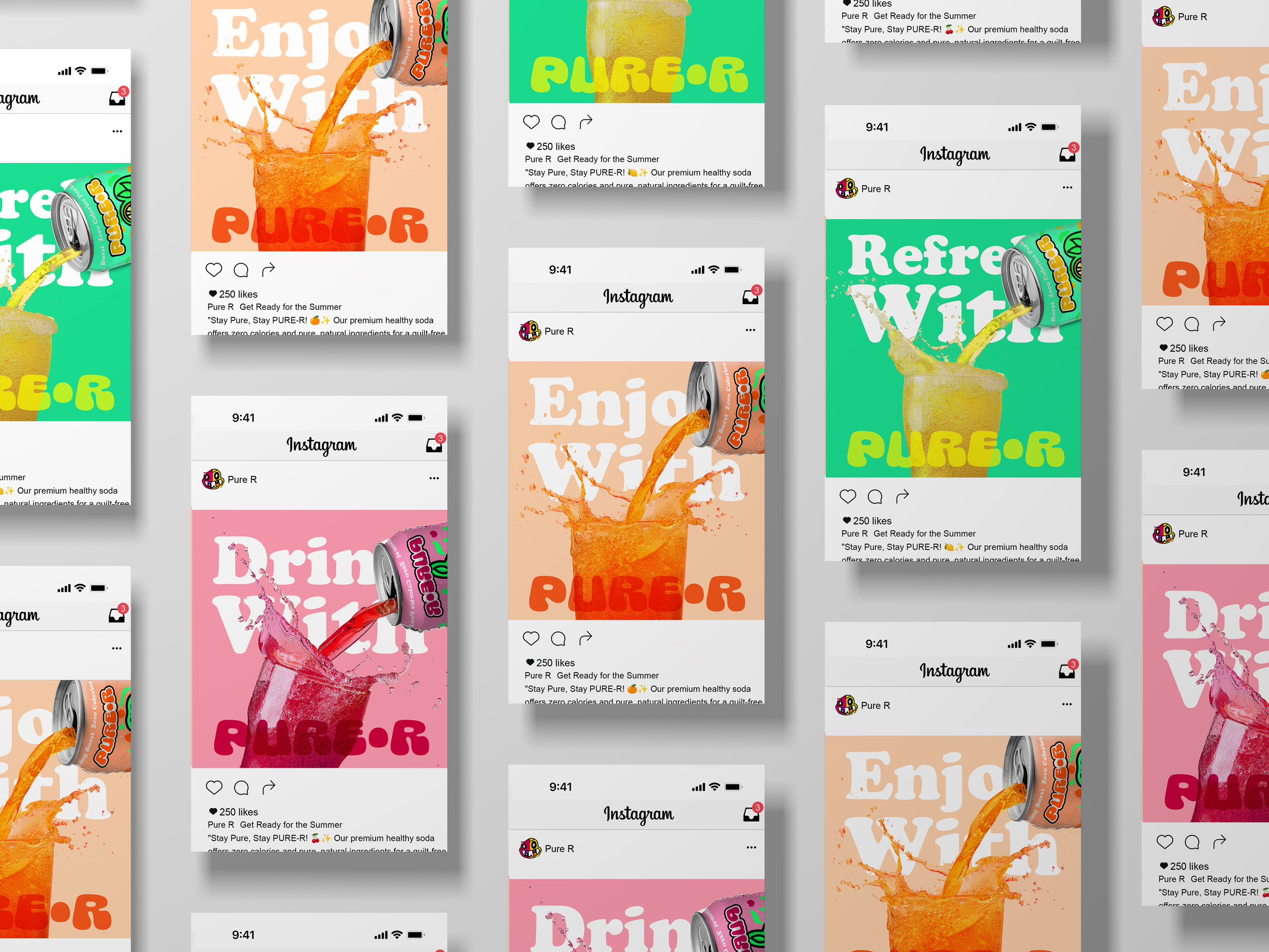 PURE R is a premium soda brand that emphasizes purity and refreshment. Designed for health-conscious consumers, PURE-R offers a zero-calorie, naturally flavored beverage with no artificial sweeteners. The brand identity revolves around the concepts of cleanliness, health, and superior taste.